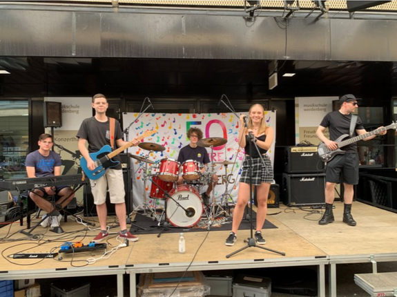 Die Schülerband der Musikschule Werdenberg steht unter der musikalischen Leitung von Guillermo Delis und begeistert mit energiegeladenen Rock-Covers das Publikum.